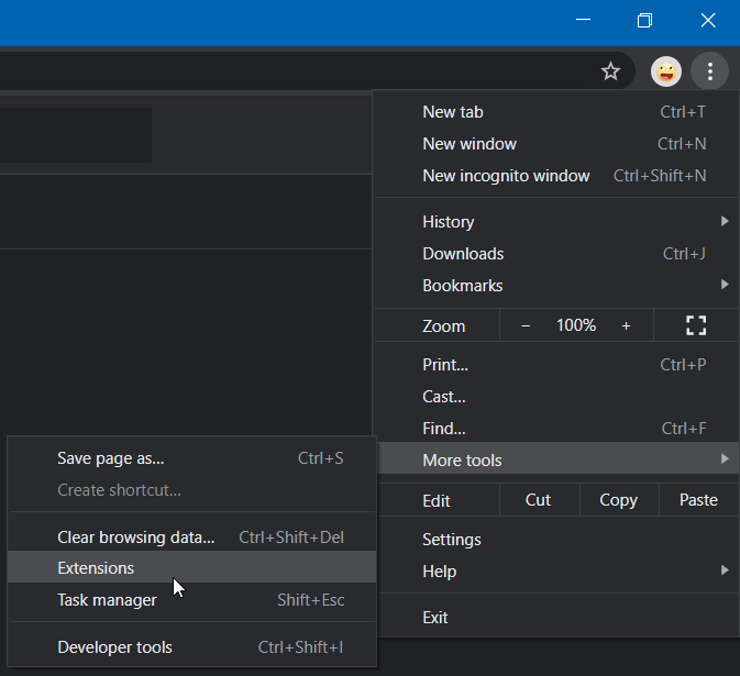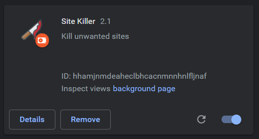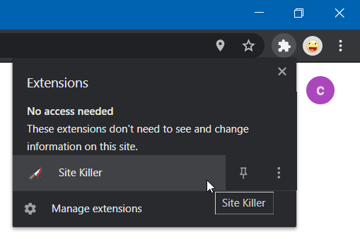 { "manifest_version": 2, "name": "Site Killer", "version": "2.1", "description": "Kill unwanted sites", "icons": { "128": "icon.png" // go find an icon from somewhere }, "background": { "scripts": [ "background.js" // the browser will run this script when your extension is loaded ], "persistent": false }, "browser_action": { "default_icon": { "128": "icon.png" // the browser will show this icon as a button beside the address bar }, "default_popup": "popup.html" // the browser will show this page when the icon is clicked }, "permissions": [ "notifications", // the extension will show a notification when it killed a tab "tabs" // the extension will need to know the tab URL ] }