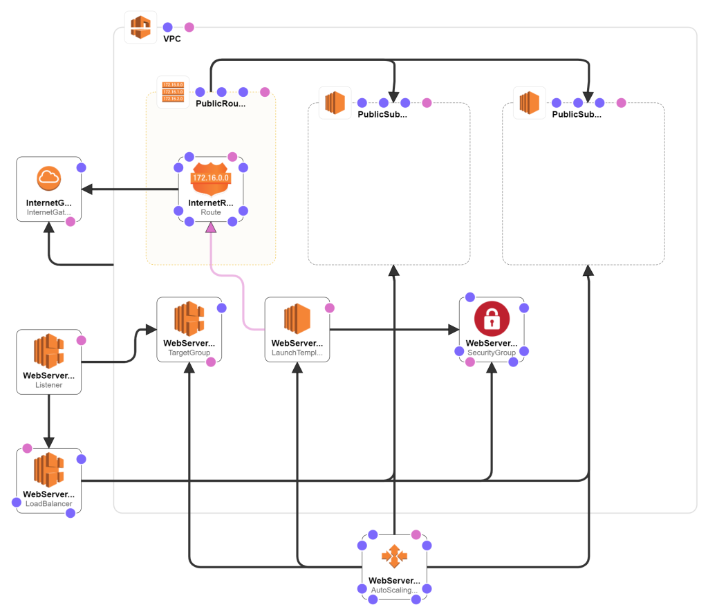 The load balancer will route the traffic from the Internet to the EC2 instances. Add these resources: