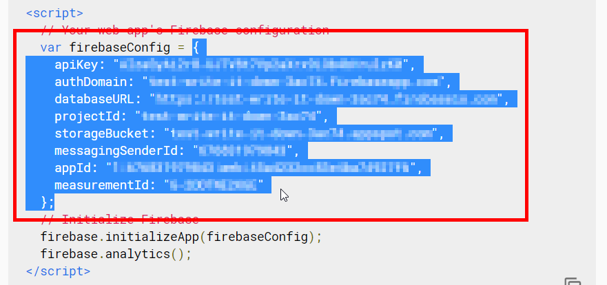 firebase.initializeApp({ apiKey: "<from_the_content_copied_just_now>", authDomain: "<from_the_content_copied_just_now>", databaseURL: "<from_the_content_copied_just_now>", projectId: "<from_the_content_copied_just_now>", storageBucket: "<from_the_content_copied_just_now>", messagingSenderId: "<from_the_content_copied_just_now>", appId: "<from_the_content_copied_just_now>", measurementId: "<from_the_content_copied_just_now>" });
