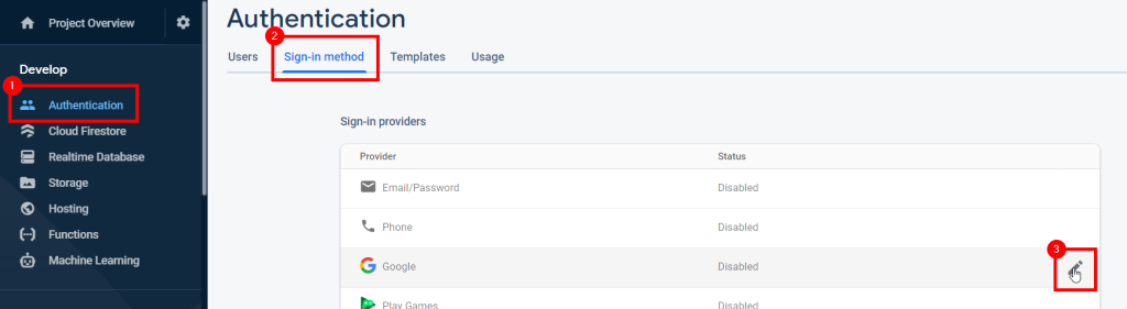 We need to setup the authentication so everyone can only see the note they own. Goto Authentication page and enable the Google sign-in method.