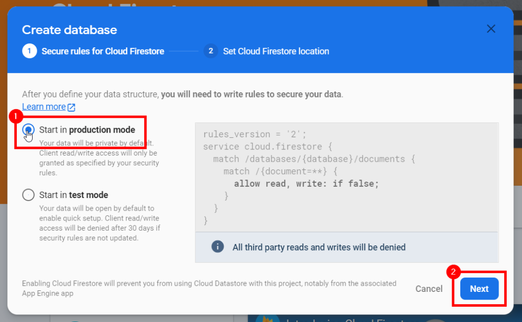 Next we have to choose the initial mode for the database. If you are doing some POC, you can start in test mode so it allows read/write access by default. We already know what we want to do, so we just choose to start in production mode.