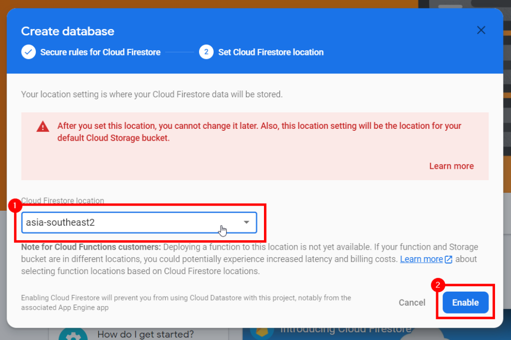 Next choose the physical location of the Firestore database. Choose a location that is closest to you so the connection is faster.